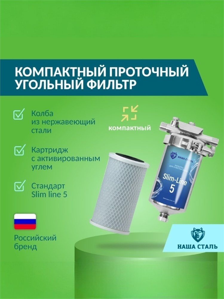 Фильтр для воды под мойку (раковину) проточный-магистральный с угольным картриджем для финишной очистки холодной воды НАША СТАЛЬ из нержавеющей стали (небольшой производительности)