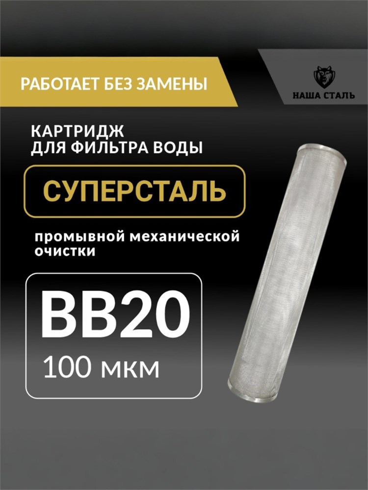 Промывной сетчатый картридж «СУПЕРСТАЛЬ» стандарта BB20 (100 микрон) из нержавеющей стали для фильтра грубой механической очистки воды аналогичного стандарта Big Blue 20