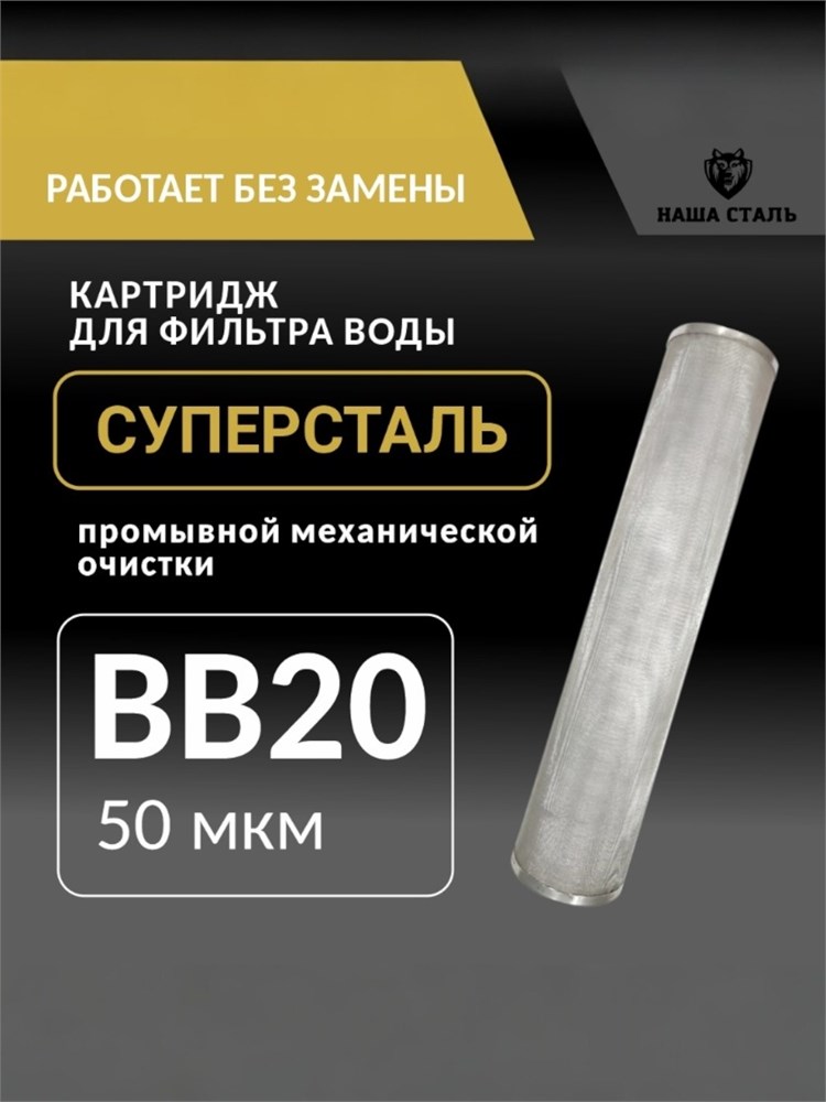 Промывной сетчатый картридж «СУПЕРСТАЛЬ» стандарта BB20 (50 микрон) из нержавеющей стали для фильтра грубой механической очистки воды аналогичного стандарта Big Blue 20