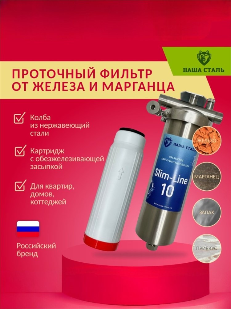 Установка любых фильтрующих картриджей стандарта Слим-Лайн 10 позволяет использовать обезжелезивающий фильтр «Наша Сталь» для очистки воды в скважине, колодце или для водопроводной воды.