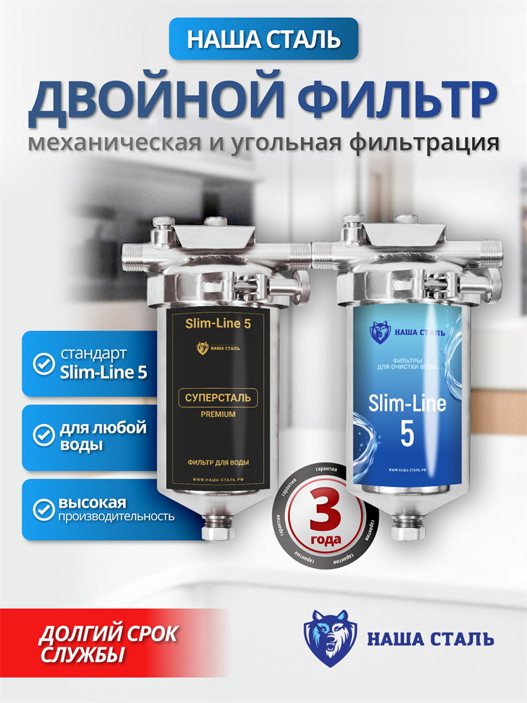 Система очистки водопроводной воды Наша Сталь,грубая механическая фильтрация и финишная, угольная Slim-line 5